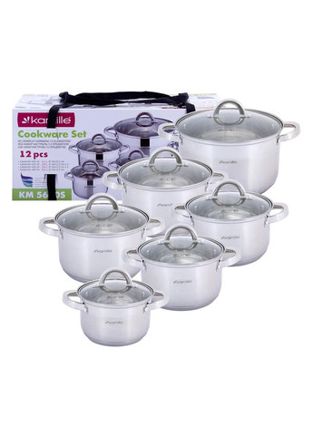Набір каструль Kamille — це завжди смачне і здорове приготування їжі. Каструлі виконані з якісної нержавіючої сталі з застосуванням сучасних технологій виробництва. Такі каструлі мають прекрасний зовнішній вигляд, оснащені 5-шаровим капсульної дном і відрізняються високою міцністю і довговічністю у використанні. Матеріал: нержавіюча сталь. Матеріал кришки: жароміцне скло. Кількість предметів в наборі: 12. Комплектація: каструлі 1.8 л (Ø16*10.5 см), 2.5 л (Ø18*11.5 см), 2.5 л (Ø18*11.5 см), 3.8 л (Ø20*12.5 см), 3.8 л (Ø20*12.5 см), 6.5 л (Ø24*14.5 см). Тип дна: 5-ти шарове капсульне. Мірна шкала: є. Спосіб кріплення ручок: клепочное з'єднання. Тип ручок: порожнисті. Кришка з отвором для виходу пари: так. Обробка металу: дзеркальнийсатин. Тип плити: електрична, склокерамічна, індукційна, газова. Підходить для миття в посудомийній машині: так. Упаковка: кольорова картонна коробка 52*27*22см. Особливості: виготовлені з високоміцної нержавіючої сталі, не піддається корозії і потьмяніння ідеальні для інтенсивного використання, стійкі до зносу мають 5-шарове капсульне дно відрізняються високою теплопровідністю і розподілом температури, що забезпечує швидке нагрівання і тривале утримання тепла усередині всіх каструль є мірна шкала з'єднання ручок виконано клепочнім способом на кожній кришці передбачено отвір для виходу пари зовнішня поверхня з дзеркально-сатиновою поліруванням підходять для всіх видів плит підходять для миття в посудомийній машині Догляд за посудом: перед початком використання необхідно видалити з виробу всі ярлики і елементи упаковки, ретельно вимити і просушити виріб після кожного використання дочекатися охолодження виробу, потім ретельно вимити і просушити не рекомендується використовувати абразивні миючі засоби і металеві щітки Використання та правила безпеки: не піддавати вироби різким змінам температури не залишати порожній посуд на вогні уникати потрапляння полум'я на ручки і бічні стінки посуду не використовувати гострі металеві аксесуари