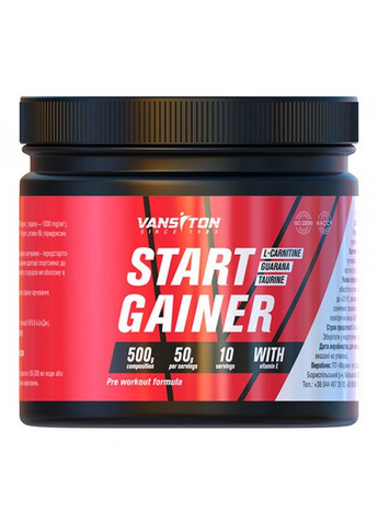Vansiton Start Gainer призначений для адаптації організму спортсмена до максимальних навантажень. Продукт дозволяє спортсменам з перших хвилин включатись у процес виконання важких фізичних навантажень. Склад препарату є енергетичним комплексом на основі природного енергетика гуарани, L-карнітину та "швидких" вуглеводів. Особливості: Покращує кровообіг Насичує напружено працюючі м `язи киснем та поживними речовинами Стабілізує та посилює процеси метаболізму в м `язових тканинах Старт-Гейнер розроблено спільно зі спеціалістами Федерації футболу України. На сьогоднішній день препарат успішно використовується у футбольних клубах. Як приймати: Приймати 50 г порошку (2-2,5 ст. ложки) розвести в 150-200 мл води або фруктового соку за 20-30 хвилин до початку фізичних навантажень, тренувань чи змагань. Вміст елементів у 1й порції 50 грам Калорії 193.6 ккал Жири 0 г Вуглеводи 49.1 г Білок 0 г Таурін 1000 мг Гуарана 1000 мг L-карнітин 1000 мг Вітамін Е (токоферол ацетат) 15 мг Вітамін В6 (піридоксин гідрохлорид) 2 мг Декстроза 46.8 г Виробник: Vansiton; Форма випуску: Порошок; Вага: 500; Кількість порцій, шт: 10; Зміст порції: 50 грам; Джерело вуглеводів: Декстроза; Зміст білка: 0; Вміст вуглеводів: 25; Добавки: Вітаміни; Пол: Жіночий, Чоловічий; Вікова категорія: Дорослі; Країна виробника: Україна; Призначення: Для набору м'язової маси, Для підвищення витривалості, Для прискорення метаболізму