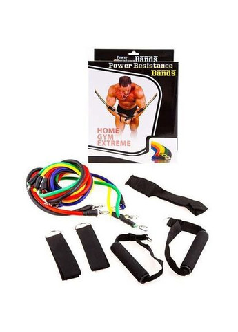 Тип: функціональні. Форма джгутів: трубчасті. Матеріал джгутів: 100% латекс. Розмір: оne size. Рівні опору: 1,4 кг, 3,6 кг, 5,9 кг. Комплектація набору: джгути опору 3 шт., рукоятки для хвату руками 2 шт., манжети на ноги 2 шт., кріплення на двері, чохол. Колір: чорний. Призначення: для тренувань м'язів тіла.