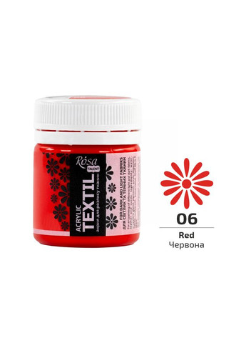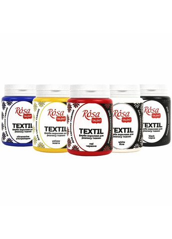 Фарба по тканині Rosa Textil - це високопігментовані акрилові фарби на водній основі, які призначені для розпису світлих і темних тканин різного складу, включаючи шкіру та замшу. Основні характеристики: фарби на водній основі; високопігментовані; якісні барвники забезпечують яскравість і стійкість кольору; високопокривні; ідеально підходять для розпису натуральних і синтетичних тканин; забезпечують фарбування волокон і надмірно не ущільнюють тканину; красиві і легко змішуються між собою, утворюючи нові відтінки. Рекомендації щодо застосування: перед нанесенням ретельно перемішайте фарбу; наносите фарбу на суху і чисту тканину; при декоруванні готового виробу покладіть між шарами тканини плівку (або інший водонепроникний матеріал), щоб запобігти проходженню фарби; для розчинення фарб використовуйте розчинник для фарб по тканині; час повного висихання - 48 годин. Після повного висихання зафіксуйте малюнок праскою без пари при температурі 30-40°C через папір або бавовняну тканину. Час прасування однієї ділянки складає 5 хвилин або більше, в залежності від типу тканини. Малюнки на речах, які не підлягають глаженню, можна закріпити в духовій шафі при температурі 120°C протягом 20 хвилин. Повна фіксація досягається без праски і прогрівання