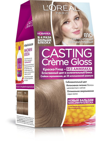 Опис Крем-фарба для волосся без аміаку - L'Oreal Paris Casting Creme Gloss Фарба для волосся Casting Cr?me Gloss, створена професіоналами відомого французького бренда L'Or?al Paris, з формулою без аміаку оптимально підходить для першого фарбування. Завдяки безлічі відтінків вона підкреслює красу природного кольору волосся. Ваш натуральний відтінок наповниться розкішними переливами і сяйним блиском. L'Or?al Paris Casting Cr?me Gloss — це стійке фарбування до 28 використань шампуню. Фарба зафарбовує сивину до 70%, робить волосся м'яким і доглянутим. Оновлені бальзами після фарбування з натуральними інгредієнтами містять масло кокоса для відтінків брюнет, лісові горіхи для каштанових тонів, мед — для блонда, ягоди годжі — для рудих відтінків. Фарбування з L'Or?al Paris Casting Cr?me Gloss — це дуже просто, всього три кроки для отримання ідеального кольору! Спосіб застосування Змішайте складники, суворо дотримуючись інструкції. Нанесіть отриману суміш на волосся за допомогою аплікатора. Потім помасажуйте, щоб закінчити фарбування і закріпити результат. Склад Aq, Cetearyl Alcohol, Propylene Glycol, Oleth-30, Deceth-3, Lauric Acid, Polyqternium-6, Glycol Distearate, Sodium metasilicate, Hexadimethrine chloride, Silica Dimethyl Silylate, CI 77891, CI 77491, m-AMINOPHENOL, p-AMINOPHENOL, Ascorbic Acid, Mica, 4-hydroxyindole, 6-hydroxyindole, Thiolactic acid, Toluene-2,5-diamine, 2-methyl-5-hydroxyethylaminophenol, p-Methylaminophenol Sulfate, Pentasodium pentetate, Carbomer, Resorcinol, Hydrogen peroxide, Sodium stannate, Trideceth-2 carboxamide MEA, Ceteareth-30, Tetrasodium pyrophosphate, Glycerin, laureth-12 ethanolamine, silica dimethil, parfum.