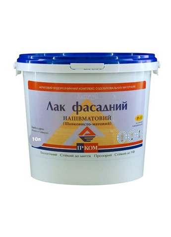 Ирком IP-15 — це лак для декоративно захисного оздоблення виробів з дерева (вікна, двері, перила, альтанки та ін.), Мінеральних поверхонь (цегла, цементно-піщані і декоративні штукатурки, бетон, декоративної фасадної плитки і штучної каменю, які піддаються інтенсивному ультрафіолетовому випромінюванню сонця, механічних і атмосферних впливів. Застосовується для зовнішніх і внутрішніх робіт. Фасадний лак IRKOM IP-15 - екологічно чиста водорозчинна композиція акрилових латексів FINNDISP® (виробництва Фінляндії) з Уф-фільтром і стабілізуючими добавками. Атмосферостійкий, стійкий до механічних впливів для виробів з дерева, мінеральних поверхонь. Властивості Розчин молочно-білого кольору після висихання утворює прозору, міцну, еластичну, водостійку плівку. Має високу адгезію до зазначених поверхонь. Добре шліфується. Не змінює колір і відтінки деревини. Стійкий до мийки побутовою хімією. Колерується водорозчинними пігментними пастами. Витримує покриття органорозчинуючі лаків. Лак виготовляється шовковисто-матовим. Застосування Лак перед використанням ретельно перемішати. Поверхня повинна бути сухою і чистою. Раніше лаковані поверхні очистити від шарів лаку, які погано прилягають до основи, і зашліфувати до однорідної матовості. Нові поверхні заґрунтувати ґрунтовкою для мінеральних поверхонь або для поверхонь з дерева, використовуючи їх відповідно до інструкції. Нанести лак в 2-3 шари. Для високої якості лакування дерева шліфувати кожен попередній шар. Наносити лак щіткою, розпилювачем. Час висихання шару 2 години, шліфувати бажано через 2-3 години при температурі + (20 ± 5) 0С і відносній вологості 60-65%.
