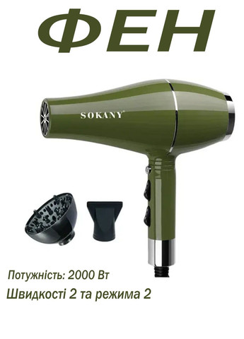 Фен для волосся 2000 вт SOKANY SK-14006 з насадками має 2 швидкості та 2 режими обдування Фен має 2 швидкості та 2 температурні режими, завдяки чому його можна використовувати для волосся різної густоти та структури. Пристрій оснащений досить довгим шнуром та петелькою для підвішування. Характеристики: Потужність: 2000 Вт Кількість швидкостей: 2 Кількість температурних режимів: 2 Матеріал: термостійкий пластик Довжина шнура: 2 м Розміри: 24*24*9 см Вага: 1 кг