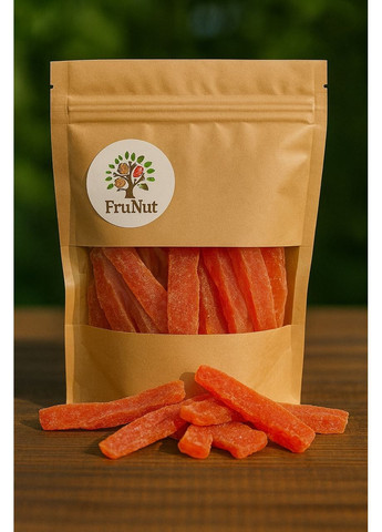 Папайя червона — яскравий тропічний сухофрукт із насиченим кольором і приємним солодким смаком. Виготовлена зі стиглих плодів, вона зберігає свій аромат, м’якість та легку фруктову кислинку. Ідеально підходить для перекусів, додавання у мюслі, гранолу, йогурти або горіхово-фруктові мікси. Опис: Папайя червона — солодкий тропічний акцент у твоєму дні! Яскрава, ароматна й натуральна — насолода, яка заряджає гарним настроєм, Корисні властивості: • Джерело вітамінів A і C — підтримує імунітет і здоров’я шкіри • Містить ферменти, що покращують травлення • Має антиоксидантні властивості • Підтримує енергетичний баланс організму, Поживна цінність (на 100г): Калорійність — 320 ккал Білки — 0,5 г Жири — 0,1 г Вуглеводи — 80 г, Зберігання: Зберігати у прохолодному, сухому місці при температурі до +20 °C, у щільно закритій упаковці, подалі від вологи та сонячного світла.