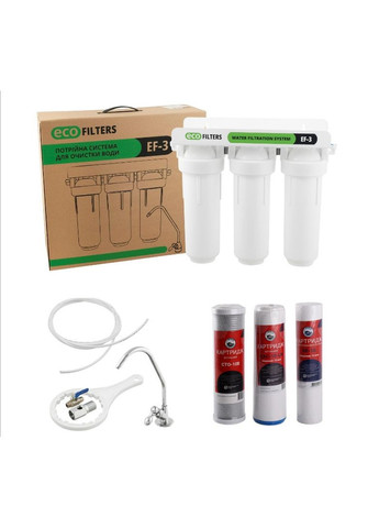 Потрійний фільтр Eco Filters EF-3 призначений для очищення проточної води. Це економний варіант отримання чистої води у Вас удома. Система встановлюється під мийкою та підключається до водопостачання. Фільтр Eco Filters EF-3 поєднує в собі високу якість і низьку вартість очиищення води. Не вимагає баку для накопичення, що значно економить місце. Не потребує підключення до каналізації. Перевагою є можливість самостійно укомплектувати систему спеціальними картриджами , враховуючи якість вихідної води та власні вимоги до очищення водии. До складу системи також входять такі картриджі: -два поліпропіленові картриджі – для механічного видалення забруднення; -картридж з спеченого вугілля - для видалення хлору та органічних сполук і також покращує смак і запах води приховати