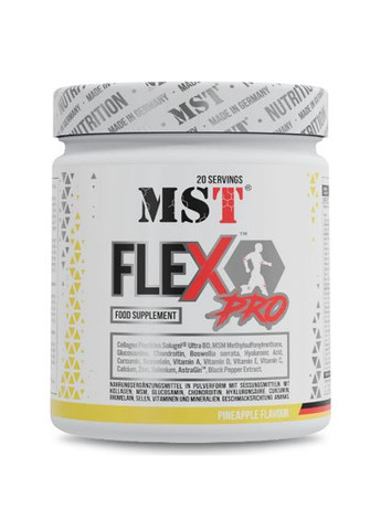 Комплекс для суглобів підвищеної дії FleX Pro MST без смаку 600 г FleX Pro MST — це інтенсивна формула для підтримки здоров’я суглобів, зв’язок і сполучної тканини. Містить гідролізований колаген, вітаміни, мінерали, глюкозамін, хондроїтин, MSM та екстракти рослин — усе необхідне для активного способу життя і відновлення після навантажень. Основні характеристики Форма випуску: порошок Порція: 15 г (1 мірна ложка) Кількість порцій: 40 (в одній упаковці 600 г) Без ароматизаторів, барвників і ГМО Смак: без смаку Склад (на порцію — 15 г) Назва речовини Кількість Призначення Вітамін A 400 мкг RE Підтримка шкіри, зору, імунітету Вітамін D 5 мкг Обмін кальцію, кісткова система Вітамін E 34 мг α-TE Антиоксидант, захист клітин Вітамін C 500 мг Синтез колагену, імунітет Кальцій 800 мг Кістки, м’язи, серце Цинк 13 мг Регенерація тканин, імунітет Селен 100 мкг Антиоксидант, щитоподібна залоза Колагенові пептиди Solugel® 5 г Підтримка суглобів і зв’язок MSM (метилсульфонілметан) 1000 мг Зменшення запалення, підтримка рухливості Глюкозамін сульфат 995 мг Суглобовий захист Хондроїтин сульфат 600 мг Підтримка хрящової тканини Екстракт босвелії 118 мг Протизапальна дія Гіалуронат натрію 53 мг Змащення суглобів Куркумін 47,5 мг Антиоксидант, протизапальна дія Бромелайн 375 мг (1200 GDU/g) Протизапальна дія, травлення AstraGin™ (екстракт женьшеню й астрагалу) 25 мг Покращення засвоєння Екстракт чорного перцю (піперин) 2,4 мг Підвищення біодоступності Інші інгредієнти Інулін Тетранатрій трикальцій цитрат Антизлежувальні агенти (діоксид кремнію) Желатин, ароматизатори (відсутні) Переваги продукту Повний спектр компонентів для здоров’я суглобів Містить гідролізований колаген, хондроїтин, MSM, вітаміни та рослинні екстракти Формула з високою біодоступністю (з AstraGin™ і піперином) Збалансований комплекс на кожну порцію Відсутність ароматизаторів і барвників Як застосовувати Змішати одну порцію (1 мірна ложка — 15 г) із 300 мл води. Приймати щодня після сніданку. Протипоказання та застереження Індивідуальна чутливість до компонентів Не рекомендується вагітним і жінкам у період лактації Не перевищувати добову порцію Про бренд MST (Muscle Science Technology) — німецький бренд, що спеціалізується на спортивному харчуванні й функціональних формулах для здоров’я. Вся продукція виготовляється з високоякісної сировини відповідно до європейських стандартів якості. Чому варто обрати саме цей продукт? FleX Pro MST — це потужний комплекс для всебічної підтримки суглобів. Завдяки поєднанню колагену, вітамінів, хондропротекторів і рослинних екстрактів, він ідеально підходить для спортсменів, людей із підвищеним навантаженням або віковими змінами у суглобах. Замовляйте зараз і підтримайте здоров’я природним шляхом!