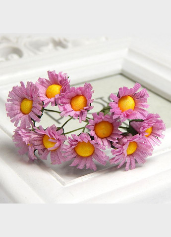 Міні-букет штучних квітів ромашки, з розпушеними пелюстками та тканевими чашолистиками. Діаметр квітки – 2 см. Довжина стебла – 8-9 см. Матеріал: текстиль, металевий дріт. Кількість квітів в букеті: 10 штук. Ціна вказана за 1 букетик. Невеличкий букетик штучних квітів — це ніжна та витончена флористична композиція для декору та творчості. Квіти виготовлені з якісного текстилю, що надає їм природного реалістичного вигляду та приємної текстури. Гнучка дротяна ніжка дозволяє легко змінювати положення квітів в букеті та закріплювати його в композиціях. Використання: Можна використовувати як цілий букетик, так і окремі квіти. Міні-букет штучних квітів ідеально підходить для оформлення листівок, вінків, подарункового пакування, флористичних композицій і різних видів рукоділля (виготовлення брошок, обручів, віночків на голову, заколок, шпильок. Мініатюрний букет додасть виробам легкості, природної краси та нотку сільського шарму.