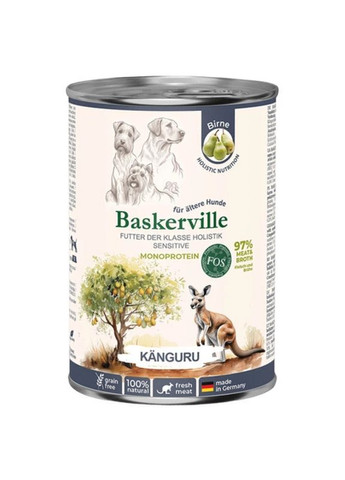 Опис товару Монопротеїновий корм BASKERVILLE із м’яса кенгуру — це преміальний продукт для собак із чутливим травленням або схильністю до алергій. Єдиним джерелом білка виступає м’ясо кенгуру — рідкісний, гіпоалергенний і дієтичний інгредієнт, який містить високу концентрацію білка, заліза, цинку та незамінних амінокислот. Такий корм сприяє підтримці м’язової маси, імунітету та загальному тонусу собаки. Завдяки натуральному складу й апетитному смаку він чудово підходить навіть для вибагливих тварин, не містить зернових та штучних добавок. Цей раціон не лише про ситість, а й про справжнє здоров’я вашого улюбленця. Переваги для вашого улюбленця: • Виготовлений з одного білкового компоненту (м’ясо кенгуру), що знижує ризик алергічних реакцій та непереносимості, що часто викликаються змішаними джерелами білка. • Завдяки залізу та цинку покращується кровотворення, зміцнюється імунітет, що сприяє здоров’ю шкіри та шерсті. • Вітаміни групи B (B2, B3, B6, B12) підтримують нервову систему, метаболізм та перетворення їжі на енергію, а вітамін B3 зменшує запальні процеси та підтримує здоров’я шлунково-кишкового тракту. • М’ясо підтримує м’язову масу та енергію, а у поєднанні з фруктами та пребіотиками (ФОС) сприяє нормалізації мікрофлори кишківника, зменшенню газоутворення та покращенню стільця • ФОС не перетравлюються в шлунково-кишковому тракті та служать джерелом їжі для корисних бактерій у кишечнику (наприклад, біфідобактерій), що сприяє покращенню мікрофлори. • У холістичній формулі відсутні барвники, ароматизатори, ГМО та шкідливі консерванти, що додатково захищає організм тварини від подразнення. • Бульйон збагачує корм ароматом і забезпечує організм колагеном, мінералами (кальцій, фосфор) та вологістю, що сприяє гідратації організму тварини. • Груша містить вітамін C, клітковину та антиоксиданти, які підтримують імунітет і покращують травлення. • Журавлина багата на вітаміни C, E, K та групи B, а також мінерали — калій, магній, залізо й марганець, що зміцнюють імунітет та підтримують обмін речовин. Вона містить природні антиоксиданти й поліфеноли, які сприяють здоров’ю сечовидільної системи, серця та шкіри. • Низький глікемічний індекс допомагає підтримувати стабільний рівень цукру в крові. • Корм містить усі необхідні вітаміни, мінерали, жирні кислоти і амінокислоти для підтримки життєвої енергії та імунітету собаки. Склад: Кенгуру 68%, бульйон 28,6%, груша 1%, журавлина 1%, мінерали 1%, соняшникова олія 0,3%, Фруктоолігосахариди (ФОС) 0,1%. Харчові добавки, на 1 кг: Вітамін D3 ( 3а671) 200 МО (міжнародних одиниць), Вітамін Е (альфа-токоферил ацетат, 3а700) 20 мг, Вітамін В1 (3а821) 10 мг, Вітамін В2 6 мг, Вітамін В6 (3а831) 2 мг, Вітамін В12 75 мкг, Ніацинамід (3а315) 15 мг, Кальцію D-пантотенат (3а841) 9 мг, Фолієва кислота (3а316) 0,35 мг, Біотин (3а880) 300 мкг, Холіну хлорид (3а890) 1200 мг, Цинк (сульфат цинку, моногідрат) (3в605) 25 мг, Марганець (моногідрат сульфату марганцю, 3в503) 1,4 мг, Мідь (купрум ІІ сульфату, петагідрат) (3в405) 1 мг, Йод (йодат кальцію, безводний) (3в202) 0,75 мг. Аналітичний склад: сирий протеїн 11,6%; сирий жир 3,0%; сира зола 3,0%; сира клітковина 0,3%; вологість 80%, вуглеводи (NfE) 2,1%, Кальцій 0,21%, Фосфор 0,18%. Співвідношення кальцію до фосфору: 1,2 : 1. Енергетична цінність: 80,70 ккал. Показання для застосування: як основний повнораціонний та додатковий корм для собак з чутливим травленням та л