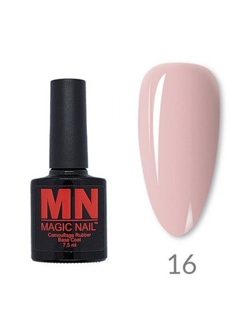 Камуфлююча база MagicNail, це базове міцне покриття, середньої консистенції, має дисперсійний (липкий) шар, поєднує функції як базового покриття під гель лак, так і самостійного покриття для любителів манікюру. Саме вирівнювальна еластична основа з камуфлюючими властивостями забезпечує супер міцне зчеплення, відмінно вирівнює і зміцнює найтонші нігті, що шаруються. Каучукова база Magic Nail для гелю добре поєднується з будь-якою системою кольорових покриттів, не вимоглива до фірм, із цією базою дуже просто працювати. Спосіб застосування: база наноситься тонким шаром на оброблений праймером ніготь. Час полімеризації в LED-лампі 30 секунд або UV-лампі 36W 2-3 хвилини. Технологія зняття: Обробіть покриття грубим бафом або пилкою, щоб зняти глянець. Це дозволить ремуверу (засобу для зняття гель-лаку) швидше проникнути крізь покриття та зняти гель-лак. Змочіть спонжик засобом для зняття гель-лаку, прикладіть до нігтя та запечатайте фольгою. Через 10 хвилин зніміть аплікацію й апельсиновою паличкою обережно видаліть гель-лак. Якщо покриття погано знімається, запечатайте ніготь повторно на пару хвилин, щоб не травмувати нігті. Відполіруйте нігтьову пластину шліфувальним бафом або пилкою. Якщо не плануєте повторно покривати нігті гель-лаком, можна зробити полірування з маслом для нігтів.