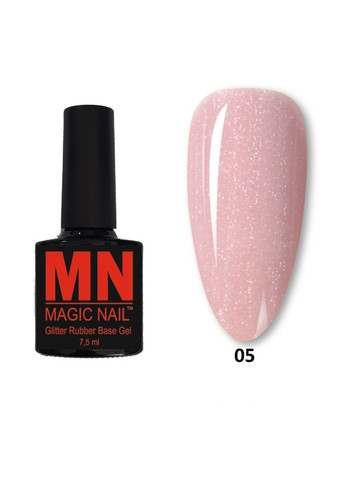 Глітерна каучукова база MagicNail, це міцне базове покриття середньої консистенції, має дисперсійний (липкий) шар, поєднує функції як базового покриття під гель лак, так і самостійного покриття для любителів манікюру. Само вирівняльна еластична основа з камуфлюючими властивостями забезпечує супер міцне зчеплення, відмінно вирівнює і зміцнює найтонші нігті, що шаруються. Каучукова глітерна база Magic Nail для гелю добре поєднується з будь-якою системою кольорових покриттів, не вимоглива до фірм, з цією базою дуже просто працювати. Спосіб застосування: база наноситься тонким шаром на оброблений праймером ніготь. Час полімеризації в LED-лампі 30 секунд або UV-лампі 36W 2-3 хвилини. Технологія зняття: Обробіть покриття грубим бафом або пилкою, щоб зняти глянець. Це дозволить ремуверу (засобу для зняття гель-лаку) швидше проникнути крізь покриття та зняти гель-лак. Змочіть спонжик засобом для зняття гель-лаку, прикладіть до нігтя та запечатайте фольгою. Через 10 хвилин зніміть аплікацію й апельсиновою паличкою обережно видаліть гель-лак. Якщо покриття погано знімається, запечатайте ніготь повторно на пару хвилин, щоб не травмувати нігті. Відполіруйте нігтьову пластину шліфувальним бафом або пилкою. Якщо не плануєте повторно покривати нігті гель-лаком, можна зробити полірування з маслом для нігтів.
