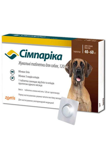 Сімпарика для собак вагою 40 кг - 60 кг від бліх і кліщів Сімпарика - жувальна таблетка зі смаком печінки, являє собою препарато нового покоління для захисту собак від бліх та кліщів. Завдяки своїй ефективності вже через 8 годин після застосування, засіб проявляє активність проти всіх видів бліх, паразитуючих на собаках, і через 12 годин проявляє дію на кліщів. Таблетки бренду Simparica (Сімпаріка) вироблені американською компанією Zoetis (Зоетіс) призначені для боротьби із зовнішніми паразитами собак: блохами, кліщами. Сімпаріка – це новітня розробка ветеринарної промисловості для вашої собаки. Діюча речовина – сароланер, відноситься до групи інсектоакарицидів, знищує фактичних ектопаразитів: впливає на всі види кліщів, включаючи іксодових. Simparica застосовується орально, таблетку згодовують собаці окремо або з їжею. Після прийому, препарат всмоктується в кровотік пса, максимальна концентрація токсину в плазмі досягається через три години. Сароланер впливає на нервову систему паразитів, що призводить до їх загибелі. В протягом перших 12 годин гинуть всі присутні шкідники. Наступні інтоксикації кліщами можливі, однак комаха вмирає, не встигнувши відкласти яйця в шерсті чотириногого друга, таким чином, знижується ризик зараження ектопаразитами підстилки тварини і місця існування. Вага 40 кг -60 кг - препарат містить 120 мг діючої речовини. Не застосовувати собакам до 8 тижневого віку. Важливим аспектом противопразитарної терапії виступає правильне застосування препарату: пес повинен повністю з'їсти таблетку Сімпарика. Таблетка зі смаком печінки. Заборонено розділяти таблетку. Антиблошина терапія проводиться щомісяця в період активності ектопаразитів, тому рекомендуємо купити таблетки від кліщів. Сароланер відрізняється низькою токсичністю, побічні ефекти від прийому Сімпаріки зведені до мінімуму. Однак якщо ви помітили індивідуальну непереносимість тварини до компонентів засобу, лікування необхідно зупинити. Клоп не є паразитом від укусів якого захищає препарат. Загальні відомості: Торговельне найменування лікарського препарату: Сімпаріка (Simparica). Міжнародна непатентована назва: caрoлaнeр. Лікарська форма: таблетки для перорального застосування. Допоміжні речовини: лактоза, натрію карбоксиметил крохмаль, кремнію діоксид колоїдний, магнію стеарат і смако-ароматичну гранульовану основу . За зовнішнім виглядом таблетки квадратної форми. Срок придатності лікарського препарату при дотриманні умов зберігання - 3 роки з дати виробництва. Забороняється застосовувати Сімпаріку після закінчення терміну придатності. Сімпаріку випускають розфасованою в блістери по 1, 3 або 6 таблеток. Блістери упаковані в картонні коробки. Зберігають лікарський препарат в закритій упаковці виробника, в захищеному від прямих сонячних променів місці, окремо від продуктів харчування і кормів при температурі від 2 ° C до 30 ° С. Сімпаріку слід зберігати в місцях, недоступних для дітей. Невикористаний лікарський препарат утилізують відповідно до вимог законодавства. Сімпаріку відпускають без рецепта ветеринарного лікаря. Фармакологічні властивості: Сімпаріка відноситься до групи інсектоакарицидних препаратів системної дії. Сароланер що входить до складу препарату - з'єднання ізоксазоліновой групи, активний відносно бліх, іксодових, саркоптоідних, псоро