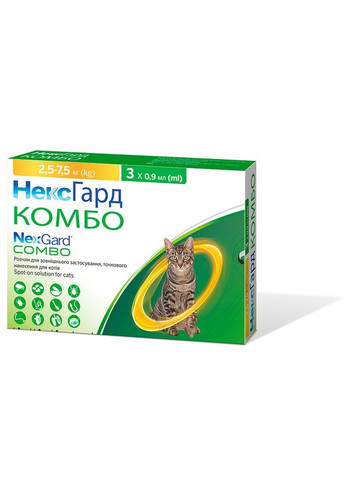НексГард Комбо — краплі від бліх, кліщів та гельмінтів для котів та кошенят від 8-тижневого віку та вагою від 2.5 до 7.5 кг. Склад 1 мл препарату містить діючі речовини: езафоксоланер - 12 мг; епріномектин - 4 мг; празіквантел - 83 мг. Допоміжні речовини: гліцеринформаль, диметил ізосорбід, бутилгідрокситолуол. Призначення: Профілактика та лікування котів при ураженнях ектопаразитами та ендопаразитами (цестодами, нематодами). Ектопаразити: Профілактика та лікування при ураженні блохами (Ctenocephalides felis). Одна обробка забезпечує знищення бліх та захист тварин на один місяць. Препарат знищує бліх до відкладення яєць і запобігає побутовому зараженню. Препарат застосовують для лікування блошиного алергічного дерматиту (БАД). Профілактика та лікування при ураженні іксодовими кліщами (Rhipicephalus sanguineus, Ixodes ricinus, Ixodes scapularis, Ixodes holocyclus, Amblyomma americanum та Haemaphysalis longicornis). Одна обробка запобігає подальшим інвазіям протягом щонайменше 6 тижнів проти Rhipicephalus sanguineus (через 48 годин після обробки), протягом щонайменше 5 тижнів проти Ixodes ricinus (через 48 годин після обробки) та Ixodes holocyclus (через 72 години після обробки), та протягом одного місяця проти Ixodes scapularis, Amblyomma americanum (через 72 години після обробки). Лікування отодектозу (Otodectes cynotis). Лікування нотоедрозу (Notoedres cati). Ендопаразити: Цестодози: Лікування цестодозів (Dipylidium caninum, Taenia taeniaeformis, Echinococcus multilocularis, Joyeuxiella pasqualei, Joyeuxiella fuhrmanni). Нематодози травного каналу: Лікування при ураженні нематодами травного каналу (личинки L3-ї, L4-ї стадії та дорослі форми нематод Toxocara cati; личинки L4-ї стадії та дорослі форми нематод Ancylostoma tubaeforme, Ancylostoma ceylanicum; дорослі форми нематод Toxascaris leonina та Ancylostoma braziliense). Нематодози дихальних шляхів та серця: Лікування при ураженні нематодами дихальних шляхів (личинки L3-ї та L4-ї стадії, незрілі та дорослі форми нематод Aelurostrongylus abstrusus; личинки L4-ї стадії та дорослі форми нематод Troglostrongylus brevior. Профілактика аелуростронгільозу (шляхом зниження рівня інвазування личинками L3-ї та L4-ї стадії Aelurostrongylus abstrusus). Профілактика дирофіляріозу (Dirofilaria immitis) протягом одного місяця. Нематодози сечового міхура: Лікування капіляріозу Capillaria plica. Механізм дії: Препарат — контактний інсекто-акарицид, активно діє на преімагінальні та імагінальні форми ектопаразитів (воші, блохи, волосоїди, кліщі) та ендопаразитів (гастроентеральні нематоди, легеневі нематоди, дирофілярії та гельмінти сечового міхура). Езафоксоланер — це (S)-енантіомер афоксоланеру, що належить до класу ізоксазоліну, активного щодо членистоногих. Езафоксоланер діє як антагоніст на хлоридних каналах, що керуються лігандами, зокрема нейромедіатором гамма-аміномасляної кислоти (ГАМК). Ізоксазоліни серед модуляторів хлоридних каналів зв’язуються з окремим і унікальним сайтом-мішенню в GABACl комах, блокуючи тим самим до- та післясинаптичне транспортування хлоридних іонів через клітинні мембрани. Тривале спричинене езафоксоланером гіперзбудження призводить до неконтрольованої діяльності центральної нервової системи та загибелі членистоногих. Висновок про селективну токсичність езафоксоланеру між членистоногими та ссавцями можна зробити на підставі диференціальної чутливості рецепторів ГАМК членистоногих порівняно з рецепторами ГАМК ссавців. Блохи та кліщі гинуть протягом 24 та 48 годин після обробки відповідно. Езафоксоланер знищує бліх до відкладення яєць, тобто
