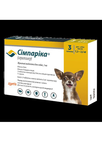 Жувальні таблетки плямистого коричневого кольору, квадратної форми з заокругленими краями. На одній стороні таблетки витиснено "5"", що вказує на кількість діючої речовини у таблетці. Склад: 1 таблетка (125 мг) містить діючу речовину: сароланер — 5 мг. Допоміжні речовини: гіпромелози ацетату сукцинат, моногідрат лактози, діоксин кремнію колоїдний безводний, стеарат магнію, кукурудзяний крохмаль, цукор кондитерський, глюкоза, висушений порошок свинячої печінки, гідролізований рослинний білок, желатин типу А, пшеничні зародки, кальцію гідрофосфат безводний. Властивості: Лікування собак при ураженнях паразитиформними кліщами (Ixodes spp., Dermatocentor spp., Rhipicephalus spp., Haemaphisalis spp., Ambylomma spp.). Препарат має безпосередню і стійку активність проти кліщів впродовж 5 тижнів. Лікування та профілактика собак при ураженні блохами (Ctenocephalides spp., Pulex irritans). Препарат має безпосередню і стійку активність проти бліх впродовж 5 тижнів. Препарат викликає загибель бліх до моменту відкладення ними яєць, що запобігає забрудненню яйцями бліх місць перебування тварин, які уражені блохами. Препарат може застосовуватися для лікування та профілактики собак при алергічному блошиному дерматиті (FAD). Лікування собак при ураженні саркоптоїдозними кліщами: власне свербуни (Sarcoptes canis) і шкіроїди вух (Otodectes cynotis) та тромбідиформними кліщами (Demodex canis). Блохи та кліщі повинні прикріпитися до шкіри собаки та проковтнути активний компонент препарату. Препарат викликає загибель бліх, які паразитують на тварині, через 8 годин, кліщів – через 12 годин. Лікування тварин препаратом опосередковано знижує ризик виникнення захворювань, які передаються кліщами (бабезіоз собак, ерліхіоз, анаплазмоз, бореліоз) впродовж 5 тижнів. Дози і спосіб застосування: Препарат застосовують собакам одноразово перорально з кормом або без корму у дозі 2-4 мг/кг маси тіла тварини. Доза препарату Сімпаріка Жувальні таблетки для собак, 5 мг – одна таблетка препарату для собак масою тіла 1.3 — 2.5 кг. Тваринам іншої маси тіла застосовують препарати з відповідним вмістом діючої речовини (10 мг, 20 мг, 40 мг, 80 мг або 120 мг). Тварини, зазвичай, вживають препарат без проблем, оскільки він має приємний смак печінки. Якщо собака не з'їдає таблетку сама, таблетку дають з кормом або примусово на корінь язика. Поділ таблетки не допускається. При лікуванні іксодидозних та сифонаптерозних інвазій препарат застосовують собакам один раз на місяць впродовж сезону активності кліщів і бліх, відповідно до епізоотичної ситуації. При лікуванні саркоптозу препарат застосовують собакам один раз на місяць впродовж двох місяців. При лікуванні демодекозу препарат застосовують собакам один раз на місяць впродовж трьох місяців. Не застосовувати собакам із відомою гіперчутливістю до діючих речовин препарату та інших складників! Не застосовувати хворим та ослабленим тваринам! Не застосовувати цуценятам віком до 8 тижнів і масою тіла до 1.3 кг без нагальної потреби та без дозволу лікаря ветеринарної медицини! Не застосовувати іншим видам тварин, окрім собак!