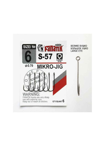 Одинарні гачки Fanatik S-57 виробляються в Кореї за найсучаснішими технологіями, зі сталі з підвищеним вмістом вуглецю VHI-Carbon. Кожен розмір виготовлений з дроту такої товщини, яка забезпечує оптимальне співвідношення міцності гачка (її багато не буває), його легкості (це важливо для забезпечення вільної роботи небольшіхсіліконових приманок), і товщини цівки (дуже тонкі гачки погано удержіваютпріманку, її доводиться постійно поправляти). Велике кругле вушко даетмонтажу необхідну свободу як при закиді, так і під час проводки приманки. Спеціальний режим термообробки забезпечує готовому гачку належну пружність, його жало піддається подвійному хімічному заточуванню. Ідеальна гольчата форма жала дозволяє гачку легко пробити пащу будь-якого хижака, високий піддів і виражена бородка втримати добичу на гачку при складному виведенні. Темне антикорозійне покриття гарантовано врятує гачок від іржі навіть в солоній воді і добре маскує його, виключаючи виникнення відблисків. Доступна ціна та відмінна якість роблять S-57 кращим гачком для оснащення шарнірних монтажів при ловлі мікроджигом. Одинарний гачок з великим вухом Fanatik S-57.