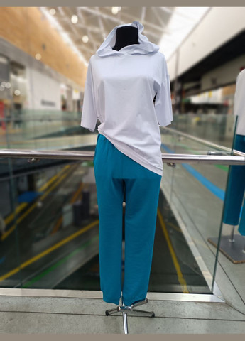 Футболка з капюшоном, рукав короткий, матеріал: трикотаж-двунитка, склад: бавовна, колір блакитний.. Можна костюмом у комплекті зі спортивними штанами. Розміри в наявності — 42, 44, 46, 48