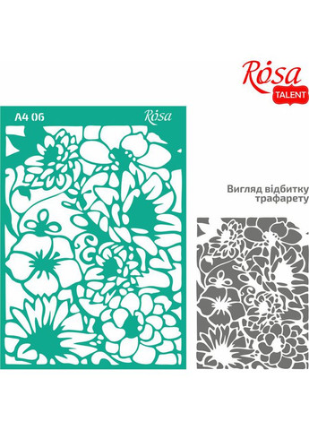 Нові мотиви багаторазових самоклеючих трафаретів від ROSA TALENT, у новому розмірі - А4 формат. Великий розмір трафарету дає нові можливості та спрощує декорування великих площ: футболки, сумки, подушки, скатертини, шухляди, кахлі. За рахунок якісної клеєвої основи ідеально лягають на різні типи поверхонь: тканина, скло, дерево, папір, полотно ґрунтоване, не дають малюнку розтікатися та не лишають слідів клею. Трафарети самоклеючі ROSA TALENT А4 формату – ідеальне рішення в роботі декораторів інтер’єрів, рукодільників, скрапбукерів, хороший помічник для студентів та школярів, надзвичайно зручний матеріал в декоруванні з дітьми. Дизайни трафаретів: • Елементи в стилі поп-арт, флористика, тварини: навушники, кеди, ловець снів, ананас, кактуси, пуанти, слон, зебра та ін. Крупний модний елемент на трафареті перетворить класичну футболку чи еко сумку у трендову унікальну річ, яка відображатиме оригінальність та власний стиль її власника. • Фонові: текстура дерева, квіти, горох в компанії з декількома кольорами фарб створять самостійний оригінальний фон на виробі, або ж стануть основою для виготовлення багатошарового панно, скрап альбому. • Бордюрні: геометрія, флористика, ажур стануть допомогою в оздобленні кутів та рамок виробу; • Український, англійський алфавіт та цифри необхідні кожному декоратору, адже вони необхідні при написанні дат, імен, цілих висловів за мінімально короткий час з оптимальною акуратністю. Самоклеючі трафарети ROSA TALENT підходять для роботи з акриловими та гуашевими фарбами, фарбами у спреях, фарбами для тканин, скла та кераміки, структурними пастами, гелями, позолотою, маркерами, крейдою, восковими олівцями та іншим. Характеристики: • Зручний формат А4 для декорування великих площ; • Міцний клеючий шар багаторазового використання; • Трафарет щільно прилягає до поверхні, зберігає малюнок від розтікання; • Стильні трендові мотиви; • Для декорування різних видів поверхонь;• Розмір літер: ширина від 1,5 до 3 см та висота - 3 см.Насолоджуйтесь процесом – декоруйте з трафаретами ROSA TALENT!