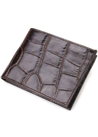 Матеріал: натуральна шкіра; Розміри (ШхВ, см): 11,5х9,5х2см; Колір: коричневий; Країна виробник: Туреччина. Опис: - основне відділення для купюр із перегородкою; - 3 кишені для карток; - дві прилеглі кишені; - монетниця, що закривається клапаном на кнопку; - без застібки; - гаманець упакований у фірмову коробочку. Чудовий чоловічий гаманець із натуральної шкіри, з тисненням під крокодила. Аксесуар має одне основне відділення з тканинною перегородкою в яке поміщаються купюри всіх номіналів, три кишені для карток, дві прилеглі кишені та монетницю. Закривається аксесуар навпіл, без застібки. На лицьовій стороні, у правому нижньому куті металевий логотип компанії виробника. Купуючи шкіряний аксесуар цієї фірми, собі чи на подарунок, будьте певні, що він прослужить Вам не один рік.