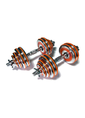 Гантелі розбірні виконані із хромованої сталі. Легка зміна дисків дозволить швидко підібрати оптимальну для себе вагу. Кожен диск доданий оранжевим демфером. Гантелі набір із двох штук допоможуть дзеркально опрацювати м'язи, вони зручні у використанні. Гантелі мають гриф із насічками, що забезпечує більше зчеплення з долонями.