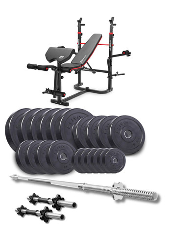 Набір Elitum Titan 109кг з лавкою HS-1080 - це поєднання універсальності, надійності та професійного підходу до домашніх тренувань. При його створенні враховувалися рекомендації досвідчених тренерів, що робить комплект ідеальним для силових вправ різного рівня. Цей набір включає диски, покриті ABS-пластиком, прямий гриф, два гантельних грифи та багатофункціональну лавку HS-1080, яка стане вашим надійним партнером у досягненні спортивних цілей. Завдяки ефективному навантаженню, яке забезпечує цей набір силового обладнання, ви зможете тренуватися вдома так само результативно, як у професійному залі. Комплект спрямований на розвиток сили, витривалості та формування рельєфу м'язів, охоплюючи всі основні групи м'язів. Ми впевнені в якості нашого обладнання, тому пропонуємо гарантію 2 роки на лавку і 5 років на штанги та гантелі. Elitum Titan 109кг - це ваш ідеальний вибір для ефективних домашніх тренувань! Склад набору: Лавка тренувальна HS-1080 Диски Elitum: 10кг - 6 шт 5кг - 4 шт 2,5кг - 4 шт 1,25кг - 6 шт Грифи: Прямий гриф 167см - 1 шт Гриф гантельний 45см - 2 шт Диски Elitum - надійність і комфорт для силових тренувань Диски Elitum, які входять до складу набору Titan 109кг, створені для тих, хто цінує якість і довговічність. Виконані з мінерального композиту та покриті ABS-пластиком, вони вирізняються високою стійкістю до механічних пошкоджень і довговічністю. Таке покриття робить диски не лише міцними, але й протиударними, що дозволяє уникнути пошкоджень підлоги під час домашніх тренувань. Однією з важливих переваг є те, що диски для штанги та гантелей Elitum майже не створюють шуму при використанні, забезпечуючи комфорт навіть у невеликих приміщеннях. Їхня конструкція гарантує надійне кріплення до грифа, що робить тренування безпечними та ефективними. Якщо ви шукаєте диски для силових тренувань, які поєднують у собі міцність та практичність, диски Elitum - це ваш беззаперечний вибір. Ідеально підходять для домашнього спортзалу, виконання базових і складних вправ. Параметри дисків: Покриття дисків: ABS-пластик Наповнення: мінеральний композит Вага дисків в комплекті: 97,5кг Сучасний дизайн Діаметр отвору: 31 мм Підходить для всіх грифів діаметром 25-30 мм Колір чорний Розміри дисків: 1,25кг - діаметр 18см, товщина 25 мм, діаметр отвору 31 мм 2,5кг - діаметр 22см, товщина 35 мм, діаметр отвору 31 мм 5кг - діаметр 26см, товщина 45 мм, діаметр отвору 31 мм 10кг - діаметр 32см, товщина 55 мм, діаметр отвору 31 мм Параметри прямого грифа Прямий гриф 167см із набору Elitum Titan 109кг стане вашим незамінним помічником для силових тренувань. Його оптимальна довжина дозволяє виконувати широкий спектр вправ - від жиму штанги лежачи до станової тяги чи підйомів на біцепс. Завдяки ретельно продуманій конструкції, гриф забезпечує рівномірний розподіл ваги та максимальний комфорт під час тренувань. Виготовлений із високоякісної сталі, цей гриф для штанги вирізняється довговічністю та витримує великі навантаження навіть під час інтенсивних занять. Хромоване покриття додає не лише естетичного вигляду, а й захищає метал від корозії, забезпечуючи бездоганний вигляд протягом тривалого часу. Рифлені ділянки на робочій зоні гарантують надійний хват, дозволяючи зосередитися на техніці без ризику ковзання. Особливо варто відзначити гайки Вейдера з гумовими ущільнювачами, які забезпечують щільну та стабільну фіксацію дисків, виключаючи їх