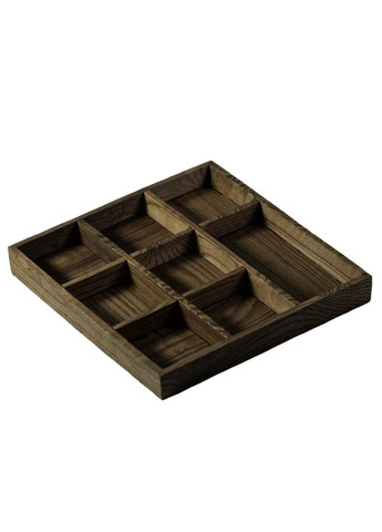 Сучасні кухонні новинки дозволяють перетворити сервіровку столу з рутинного процесу в справжнє мистецтво. Так, щоб вишукано розмістити на столі страви, часто використовується менажниця. Секційний посуд дозволяє компактно розподілити відразу кілька закусок без ризику їх перемішування між собою. Менажниці отримали велику популярність в суші-барах, так як завдяки їм можна красиво оформляти роли і суші в різних секціях. Без сумніву, цим кухонним начинням буде задоволена будь-яка господиня, бо у неї зникне необхідність бігати до столу з тарілками. Розміри зовнішні: ширина - 27см, довжина - 27см, висота - 9см. Матеріал: дерево. Покриття: акриловий лак. Продається тільки менажниця, без піал, горіхів, солодощів, сухофруктів та іншого наповнення! Виріб ручної роботи та виготовлений виключно з натуральних, екологічно чистих матеріалів.