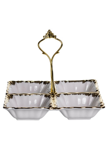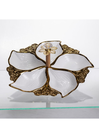 Менажниця порцелянова на 5 секцій - це ідеальний аксесуар для тих, хто цінує стиль та елегантність у сервіруванні столу. Виготовлена з високоякісної білої порцеляни, ця менажниця має не тільки естетичну привабливість, але й практичність. Її розміри 30х30х13 см роблять її універсальною для подачі різноманітних закусок, фруктів, горіхів або солодощів. Ця монажниця вирізняється своїм вишуканим дизайном у формі квітки, яка додасть вашому столу нотку розкоші. Золотий декор та ручка з кристалом додають їй шляхетності та роблять її чудовим вибором для святкових заходів. Завдяки поділу на 5 секцій, ви зможете красиво та зручно розмістити різні частування в одному посуді, що зробить ваше сервірування не тільки стильним, але й функціональним. Основні характеристики менажниці: Розмір: 30×30×13 см Кількість секцій: 5 шт Об'єм секції: 100 мл Матеріал: фарфор Переваги фарфорової менажницы: Елегантний дизайн з позолотою, підходить для будь-яких заходів Зручний поділ на секції, що дозволяє легко організувати подачу частування Легкість у догляді — монажниця легко миється і не вимагає особливого догляду Відмінний подарунок для поціновувачів стильного сервірування та домашнього затишку Ця монажниця стане незамінним елементом вашого посуду як для повсякденного використання, так і для особливих випадків. Вона ідеально підійде для сімейних свят, дружніх зустрічей чи романтичних вечерь. Завдяки своєму елегантному зовнішньому вигляду та функціональним особливостям, вона також може стати чудовим подарунком для близьких, які люблять гарно сервірувати стіл. Вибираючи фарфорову менажницу на 5 секцій, ви отримуєте не тільки практичний предмет, а й стильний елемент інтер'єру, який радуватиме вас і ваших гостей протягом багатьох років.