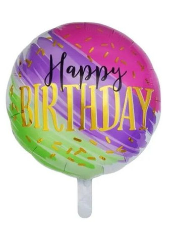 Фольгована кулька коло 18" (45см) з клапаном. Малюнок мазки пензля "HAPPY BIRTHDAY". Матеріал кульки фольгований поліетилен. Викорустовується як з повітрям так і з гелієм. Продається від 1 шт (поштучно).