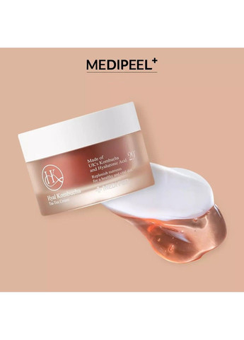 Зволожуючий крем-гель для обличчя з комбучею Medi-Peel Hyal Kombucha Tea-Tox Ampoule, 50 мл Подвійний крем відновлює, зволожує та живить шкіру, зменшує видимість зморшок, надає пружності та щільності. Бореться з сухістю та лущенням, усуває тьмяність, робить шкіру гладкою та сяючою. Засіб зміцнює природний захисний барєр, підвищує місцевий імунітет шкіри, прискорює загоєння мікроушкоджень. Незвичайна двофазна текстура дозволяє регулювати щільність крему: для жирної та комбінованої шкіри можна додавати більше гелю, а для шкіри, схильної до сухості - більше кремової текстури. Комбуча у складі крему продовжує молодість шкіри, зменшує виразність зморшок, підтримує пружність та рівний рельєф. Властивості: Екстракт чайного гриба (Комбуча) - тонізує та підвищує імунітет шкіри, усуває тьмяність, зволожує та живить. Має яскраво виражену антиоксидантну дію, зміцнює тургор і покращує проникність тканин, завдяки чому всі компоненти засобу проникають глибше в шкіру і краще нею засвоюються. Екстракт камелії - контролює роботу сальних залоз, знижує жирний блиск та бореться із запаленнями. Містить коензим Q10, підвищує енергетичні можливості клітин, запобігає появі зморшок, посилює захисний барєр. Екстракт рису - чудово справляється з дефектами шкіри. Має зволожуючу, протизапальну, помякшувальну і відновлюючу дію. Збагачує шкіру найважливішими амінокислотами, вітамінами, залізом, йодом, фосфором та кальцієм. Він допомагає боротися з пігментацією, добре очищує та відбілює шкіру, прискорює регенерацію тканин та сприяє розгладжуванню зморшок. Гіалуронат натрію - це натрієва сіль гіалуронової кислоти, її низькомолекулярна форма. Проникає у глибокі шари епідермісу, активно зволожує клітини, сприяє утриманню вологи у шкірі. Згладжує дрібні зморшки та вирівнює поверхню епідермісу. Гіалуронова кислота - проникає у глибокі шари шкіри та наповнює клітини необхідною вологою. Зміцнює шкірний покрив та покращує пружність шкіри, попереджаючи раніше появу зморшок. Поповнює нестачу вологи та усуває зневоднення шкіри. Кераміди - сприяють оновленню шкіри, покращують захисні та барєрні функції, нормалізують гідроліпідний баланс, захищають від зневоднення, мають омолоджуючий потенціал. Підвищують захисні функції епідермісу, запобігають втраті вологи та допомагають відновити шкіру. Позбавляють сухості, лущення. Мадекасосид - має багатофункціональну дію на шкіру: стимулює синтез волокон колагену та еластину, підвищує еластичність епідермісу, помякшує, стимулює відновлення шкіри, робить зморшки менш вираженими та підтягує овал обличчя. Масло баобаба - відновлює шкіру, багате на незамінні жирні кислоти, антиоксиданти, вітаміни C, A і E. Ніацинамід - сприяє стимуляції синтезу колагену та покращенню захисних функцій шкіри, допомагає знизити трансепідермальну втрату вологи зі шкіри та знизити пігментацію, помякшує, підвищує еластичність шкіри, зволожує, звужує пори. Заспокоює, ефективний при використанні для чутливої шкіри, виявляє зігрівальну дію та покращує мікроциркуляцію крові, освітлює. Рожева вода - зволожує, прибирає сліди втоми, робить шкіру яскравою та сяючою. Оптимізує гідробаланс шкіри, усуває сухість, стягнутість та лущення. З її допомогою розгладжується текстура епідермісу, зменшується глибина зморшок, йдуть набряки, вирівнюється тон обличчя та покращуєт
