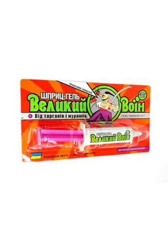 Гель від тарганів Великий воїн 30 г Інноваційний інсектицидний гель застосовується для знищення тарганів та мурах на різних житлових і нежитлових ділянках та в приміщеннях. Однієї упаковки гелю достатньо для обробки приміщення до 50кв.м. Головна перевага в тому що інсектицидна складова діє не відразу і заражені комахи інфікують всю колонію. Переваги гелю Великого воїна: - Не викликає резистентності у комах - Володіє тривалим періодом захисної дії - Має у складі привабливі для комах компоненти - Економний у використанні завдяки шприцу-дозатору