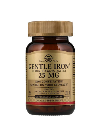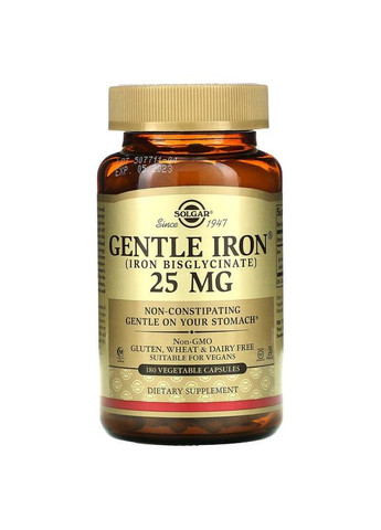 Залізо (Gentle Iron) - найкраща форма заліза як бісгліцинату заліза. Максимальне засвоєння та ефективність. Деякі добавки заліза викликають подразнення шлунково-кишкового тракту та запор. Ця унікальна форма хелатного заліза (бісгліцинат заліза) розроблена для покращення абсорбції і не дратує ШКТ. Патенти США № 6,706,904 та 6,716,814 ліцензовано Albion International, Inc. Вегетаріанський продукт. Виробник: Solgar, США Форма випуску: 90/180 капсул Вік: 18+ Склад: Компонент Склад 1 капсули Залізо-бісгліцинатний хелат 25 мг Інші інгредієнти: Мікрокристалічна целюлоза, рослинна целюлоза, магнію стеарат. Не містить: ГМО, глютена, пшениці, молочних продуктів, сої, дріжджів, цукру, натрію, штучних ароматизаторів, підсолоджувачів, консервантів та барвників. Веганський, кошерний, халяльний продукт. Функціональна дія: Залізо (Gentle Iron) від Solgar - це формула, що забезпечує запатентовану форму заліза, яка не викликає відхилень з боку роботи кишечника. Один із найважливіших елементів в організмі людини – залізо. Важко повірити, але в організмі кожного дорослого міститься до 5 г, 70% з яких припадає на склад гемоглобіну, який є постачальником кисню для всього організму. Крім того, залізо бере активну участь, як каталізатор, у багатьох біохімічних реакціях організму, а також структурну побудову м'язових білків. Залізовмісні продукти: всі види м'яса, печінка, яєчні жовтки, горбуша та скумбрія, волоські горіхи, буряк, яблука, персики, виноград, сливи, груші та гранати. Для хорошого засвоєння заліза організмом його потрібно приймати з продуктами багатими на вітамін С та фолієву кислоту. Нестача заліза в організмі проявляється болючим кольором шкіри та її надмірною сухістю, постійною (хронічною) втомою, неможливістю концентрації уваги та дратівливістю. Залізовмісні добавки показано приймати людям при гострих інфекційних захворюваннях, рясних крововтратах, вагітним жінкам, а також тим, хто зловживає чаєм та кавою. Організм дуже швидко втрачає залізо при рясних місячних та кровотечах, захворюваннях шлунка, кишечника та печінки, а також при несприятливому впливі зовнішнього середовища. Нестача його призводить до анемії. Застосування: Приймати по 1 капсулі щодня під час їжі. Протипоказання: Індивідуальна непереносимість компонентів. Застереження: При вагітності, годуванні грудьми, прийомі медичних препаратів чи наявності будь-яких захворювань слід проконсультуватися з лікарем перед вживанням харчових добавок. У разі виникнення побічних реакцій припиніть використання та проконсультуйтеся з лікарем. Зберігати у недоступному для дітей місці. Не використовувати, якщо зовнішня захисна мембрана відсутня чи пошкоджена. *** Виробник залишає за собою право змінити зовнішній вигляд упаковки. Ми намагаємося стежити за змінами, але якщо ви помітили будь-яку невідповідність, будь ласка, повідомте нам про це в листі або коментарі до товару. Дякуємо! **** БАД не є лікарським засобом!