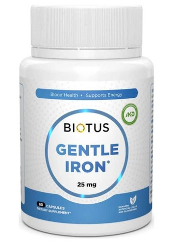 Gentle Iron Biotus, 25 мг, 60 капсул Gentle Iron Biotus – висококоефективне та м’яке для шлунка джерело заліза у вигляді хелатного гліцинату заліза для підтримки енергії, кровотворення та імунітету. Переваги: Легко засвоюється — менше подразнення шлунково-кишкового тракту Підтримує нормальний рівень гемоглобіну та еритроцитів Допомагає знижувати втому та підвищує життєвий тонус Сприяє нормальному функціонуванню імунної системи Склад на порцію (1 капсула): Інгредієнт Кількість Гліцинат заліза (у перерахунку на залізо) 25 мг Кількість порцій: 60 капсул Рекомендації зі споживання: Дорослим по 1 капсулі 1 раз на день під час їжі, запиваючи водою. Умови зберігання: Зберігати в сухому, темному місці при температурі +5…+25 °C. Берегти від дітей. Протипоказання: Індивідуальна чутливість до компонентів. Не перевищувати рекомендовану добову дозу. Перед застосуванням при вагітності, лактації або захворюваннях крові – консультація лікаря.