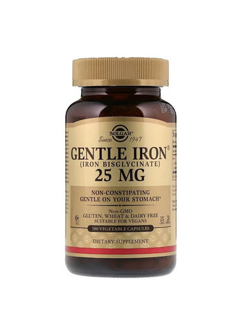 Gentle Iron від Solgar — це харчова добавка, що містить хелатну форму заліза — бісгліцинат заліза, відому свою м'яку переносимість з боку травної системи. Розмір порції: 1 вегетаріанська капсула Кількість порцій: 180 Кількість на порцію % від добової потреби** добавки заліза викликають подразнення шлунково-кишкового тракту та викликають запор. Ця унікальна форма хелатного заліза (бісгліцинат заліза) розроблена для покращеного засвоєння та має м'який вплив на організм. ** Відсоток від добової потреби ґрунтується на дієті в 2000 калорій.