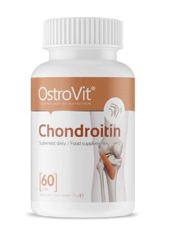 OstroVit Chondroitin – препарат на основі хондроїтину. Хондроїтин сульфат рекомендується приймати з профілактичною метою при заняттях важкою атлетикою. Хондроїтин – це важливий структурний компонент хрящової тканини та зв'язок, який збільшує їхню міцність при стисканні та розтягуванні. Входить до складу хряща, надаючи йому пружність та амортизуючі властивості за рахунок утримання води у тканині. Виходить із хрящової та кісткової тканини тварин, кісток та хрящової тканини риб. Хондроїтин сульфат утворюється в організмі хрящової тканини і входить до складу синовіальної рідини суглобів, яка виконує функцію, що змащує. Втрата хондроїтину в хрящі є головною причиною остеоартриту. Хондроїтин сульфат має протизапальну дію, яка реалізується гальмуванням активності лізосомальних ферментів, супероксидних радикалів та експресії прозапальних цитокінів. Крім того, хондроїтин сульфат стимулює розвиток клітин хряща - хондроцитів та синтез протеогліканів. Також він має антикатаболічну дію за рахунок інгібіції металопротеїназ – стромелізину, колагенази, фосфаліпази А2. Хондроїтин сульфат активує синтез гіалуронової кислоти, продовжує термін життя хондроцитів та нормалізує структуру субхондральної кістки. Доведено також ефект хондроїтин сульфату в інтенсифікації репарації гіалінового хряща. При річному курсі хондроїтин сульфату значно покращується рухливість суглоба (до 50%), знижується вираженість больового синдрому та стабілізуються рентгенологічні показники (величина міжсуглобового проміжку та загальна товщина хрящової пластини). Зниження вираженості больового синдрому та збільшення обсягу рухів настає вже на третьому місяці лікування та значно збільшуються на шостому та дванадцятому місяці з початку курсу лікування хондроїтин сульфатом. Поживна цінність в одній порції – 1 таблетка: Хондроїтинсульфат - 800 мг інгредієнти Хондроїтинсульфат, наповнювач – мікрокристалічна целюлоза, протилежні агенти: солі магнію, жирні кислоти, двоокис кремнію, наповнювач – крохмаль. Рекомендації щодо застосування: Використовуйте 1 порцію (1 таблетку) щодня, переважно вранці.