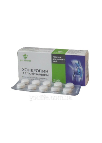 Якщо Вам відомо, що таке проблеми з суглобами або з хребтом, які нагадують про себе хрускотом, болем і ломотою, порушенням рухливості суглобів - настав час спробувати біодобавку "Хондроїтин з глюкозаміном". Хондроїтин із глюкозаміном стимулює синтез гіалуронової кислоти – речовини, яка є основою сполучної тканини, у тому числі й хряща. ДД сповільнює дію патологічних ферментів, які руйнують хрящ, а також має протизапальну та знеболювальну дію, сприятливо впливає на відновлення кістково-хрящових структур за рахунок покращення мінерального обміну. Склад: хондроїтин сульфат 90% з акулевого хряща – 0,15 г, глюкозамін – 0,25 г, кислота аскорбінова (віт. С) – 0,005 г. Хондроїтин забезпечує живильну підтримку суглобів, сухожилля, звязок і кісток і зміцнює їх. Це найпотужніша речовина, яка бере участь у побудові хрящових та сполучних (сухожильних та звязуючих) тканин. Глюкозамін необхідний для побудови сполучної тканини, вони стимулюють утворення колагену, сприяють покращенню живлення хрящової тканини, що оточує суглоби. Спосіб застосування: по 1-2 таблетки 3 рази на день, запиваючи склянкою води. Курс прийому: тривалість застосування щонайменше двох місяців. індивідуальна непереносимість компонентів препарату. При вживанні антибактеріальних препаратів проконсультуйтеся з лікарем. Термін зберігання: 24 місяці. У сухому місці при температурі від 0°С до +25°С. Виготовлено в Україні: ТУ У 15.8-32547646-001-2003 Сертифіковано Міністерством Охорони Здоровя України №05.03.02-04/53347 від 30.12.2004 Якість гарантуємо !!!