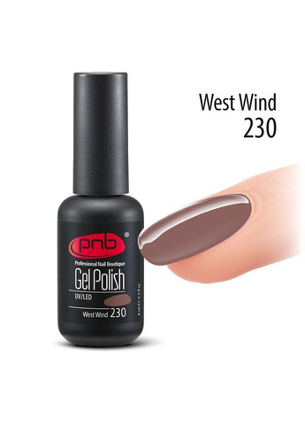Гель-лак PNB West Wind 230 West Wind – м'який, темно-рожевий із сірим підтоном. Колір бутону попільної троянди, що не розкрився, стриманий і благородний. Багатогранний відтінок гармонійно поєднується з подібними йому складними, м'якими природними відтінками. Але також може вигідно підкреслити красу ваших рук у поєднанні з контрастно-насиченими кольорами одягу з гардеробу. Емалеве, еластичне покриття з покриваністю в 1 шар. На основі формули, що складається з безпечних для здоров'я інгредієнтів (без формальдегідних смол, дибутилфталату (DBP), камфори, толуолу, ксилолу, метакрилової кислоти, HDDA – 7 Free). Без різкого запаху. Зі властивостями самовирівнювання. Носибельність 14 днів. Наноситься в 1-2 тонкі шари поверх підготовлених нігтів. Час повної полімеризації кожного шару гель-лакового покриття становить 1 хвилину в ЛЕД, УФ/ЛЕД гібридних лампах. Покривається манікюр топом із липким або без липкого шару. Просушується. 8 мл