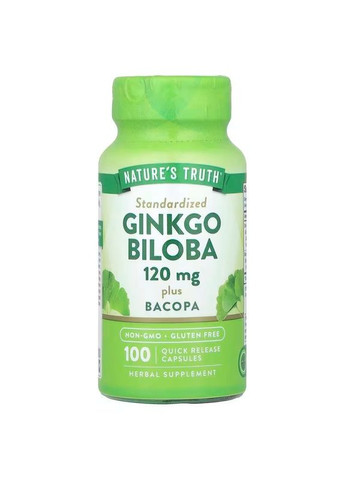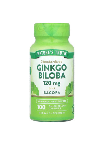 Гінкго білоба плюс бакопа, Ginkgo Biloba Plus Bacopa, Nature's Truth - це харчова добавка, в основі якої рослинні екстракти сприяють поліпшенню мозкового кровообігу, зміцненню судин, підвищенню працездатності, нейтралізації дії окислювального стресу Розмір порції: 1 капсула швидкого вивільнення Кількість порцій: 100 Кількість на порцію % від добової потреби† Екстракт гінкго білоба (Ginkgo biloba) (лист) (стандартизований до вмісту 24% флавонових глікозидів гінкго) 120 мг * Бакопа (Bacopa monnieri) (трава) (з 13,33 мг екстракту 3:1) 40 мг * * Добова потреба не визначена.