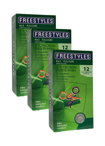 Готовий до ще більшої стимуляції? Freestyles Max Pleasure мають унікальну поверхню з пухирцями, що додають нових відчуттів і дарують виняткове задоволення обом партнерам. В упаковці: 3 коробки по 12 презервативів (разом 36 шт). Матеріал: високоякісний натуральний гіпоалергенний латекс. З накопичувачем для комфорту та безпеки. Поверхня з пухирцями для додаткової стимуляції. Вкриті дерматологічно нейтральною силіконовою змазкою. Freestyles Max Pleasure — це новий рівень насолоди та близькості, коли стандартні відчуття вже не достатньо. Порада від Dealer’a: бери цей набір для експериментів Крапки на презервативі — це маленькі вибухи задоволення у найпотрібніший момент!