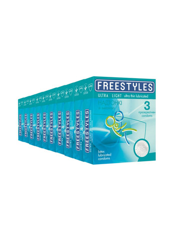 Хочеш відчувати максимум природності та близькості? Freestyles Ultra Light настільки тонкі, що їх майже не відчуваєш! Гладка поверхня і надтонкі стінки дарують ефект «як без презерватива», але з надійним захистом. В упаковці: 10 коробок по 3 презервативи. Виготовлені з високоякісного натурального гіпоалергенного латексу. З накопичувачем та особливо тонкою стінкою. Вкриті дерматологічно нейтральним силіконовим мастилом. Відповідають європейським стандартам, перевірені електронікою. Freestyles Ultra Light — твій надійний захист від небажаної вагітності та інфекцій, що передаються статевим шляхом.