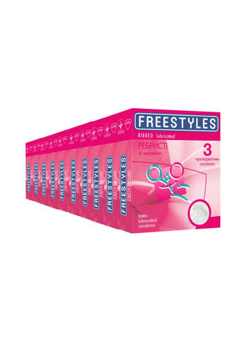 Хочеш більше стимуляції та гострих відчуттів? Freestyles Ribbed мають рельєфну поверхню з ребрами, які створюють додаткову стимуляцію та дарують максимальне задоволення обом партнерам. В упаковці: 10 коробок по 3 презервативи (разом 30 шт). Виготовлені з високоякісного натурального гіпоалергенного латексу. З накопичувачем для комфорту та безпеки. Вкриті дерматологічно нейтральною силіконовою змазкою. Відповідають європейським стандартам якості, перевірені електронікою. Freestyles Ribbed — це новий рівень стимуляції та безпеки у твоєму інтимному житті. Порада від Dealer’a: візьми цей набір, коли хочеш урізноманітнити вечір Ребра на презервативі — як турборежим для задоволення!