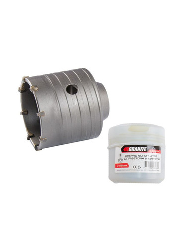 Свердло корончасте для бетону GRANITE Свердло корончате GRANITE призначене для ударного просвердлювання отворів великого діаметру в керамічній облицювальній плитці, бетоні, граніті, цеглі, дереві, гіпсових плитах. Коронка забезпечує м'яке та швидке свердління. Опис: твердосплавна напайка з карбіду вольфраму твердість – 89-90 HRC діаметр – 65 мм кількість зубців – 8 шт хвостовик у комплекті - ні розмір упаковки – 0,085x0,07x0,07 м вага – 0.52 кг Інструмент ТМ «GRANITE» відповідає міжнародним нормам та стандартам якості, відповідає всім вимогам щодо безпеки. Торгова марка «GRANITE» завжди тісно пов'язана з нововведеннями та якісними комплектуючими. Маючи високий рівень точності та потужності, а також максимальну безпеку для користувачів, надійні та зручні інструменти торгової марки «GRANITE» універсальні і роблять процеси свердління, закручування, пиляння, шліфування та оздоблення набагато простіше. Серед основних переваг інструменту торгової марки "GRANITE" споживачі заслужено відзначають співвідношення «ціна-якість», розвинену мережу сервісних центрів, якість сервісних послуг.