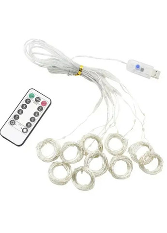Прилад має десять ниток зі світлодіодними лампочками із білим кольором свічення, які розпускаються вниз. Загальна кількість ламп у гірлянді – 100 шт, кожна має краплеподібну форму. Живиться прилад від електромережі, павербанку та другого джерела енергії через USB роз'єм. Має 8 режимів свічення, які регулюються пультом (батарейки в комплект не входять). джерело живлення: USB; ступінь захисту: IP 56; форма лампочки: крапля; кут свічення: 360 град; колір: білий холодний Розмір: висота 3 м , ширина 1 м