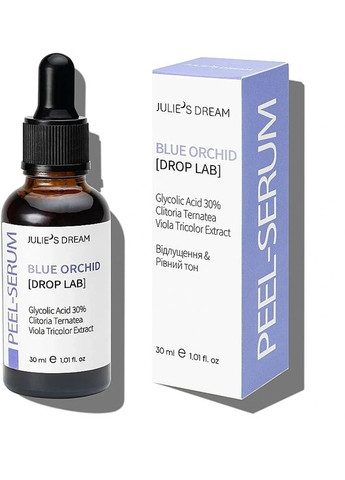 Peel-Serum Blue Orchid [DROP LAB] – ніжний і ефективний засіб для делікатного відлущування шкіри, стимуляції її оновлення та боротьби з ознаками старіння та запаленнями. Унікальна формула поєднує дію активних кислот з заспокійливими компонентами, що забезпечують м'яке очищення, стимулюють оновлення клітин і надають глибокий догляд. Ефекти від використання: - Оновлення та регенерація – шкіра стає гладкою, свіжою та сяючою. - Освітлення та вирівнювання – тон обличчя рівний, пігментація зменшена. - Зменшення ознак старіння – дрібні зморшки розгладжені, шкіра виглядає підтягнутою та молодшою. - Захист і заспокоєння – усуває подразнення та надає відчуття комфорту. Активні компоненти: - Настій квітів тайської голубої орхідеї (Кліторії) – багатий на антоціани та вітаміни, має антиоксидантні, регенеруючі та омолоджувальні властивості. Стимулює синтез колагену, тонізує шкіру та усуває ознаки старіння. - Надкритичний СО2 екстракт фіалки трьохколірної – природний антиоксидант, що заспокоює шкіру, бореться зі зморшками та захищає від фотостаріння. - Гліколева кислота (30%) – інтенсивно очищує пори, активізує обмінні процеси, відновлює баланс шкіри та контролює вироблення себуму. - Гліцерин та натрію альгінат – забезпечують зволоження, утримують вологу в клітинах шкіри, сприяючи її еластичності та м’якості.