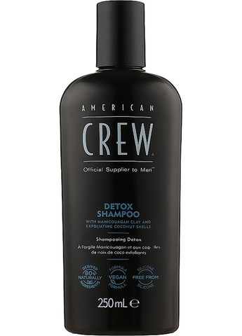 Шампунь від бренда American Crew - глибоке очищення волосся і шкіри голови. Його формула розроблена з урахуванням особливостей пасом і шкірного покриву чоловіків. Продукт наділений багатофункціональними властивостями: він не лише ретельно видаляє забруднення і себум, але і виводить токсини, відлущує ороговілі часточки, вимиває залишки стайлінгових продуктів. Склад не містить інгредієнтів тваринного походжень і кремнію. Він є на 100% веганським і збагачений манікюаганською глиною і подрібненими часточками шкаралупи кокоса. Упаковка виготовлена ??з 80% переробленого пластику. Особливості American Crew Detox Shampoo: - наділений динамічним фірмовим ароматом з нотками м'яти і цитрусових; - часточки кокосової шкаралупи стимулюють мікроциркуляцію крові і оздоровлюють шкіру голови; - манікюаганська глина постачає пасма мікроелементами, в тому числі - залізом, кальцієм, натрієм, калієм і цинком; - підтримує рівень вологи у клітинах; - видаляє накопичені залишки стайлінгових приладів; - формула - 80% інгредієнтів натурального походження; - не рекомендується використовувати щодня.