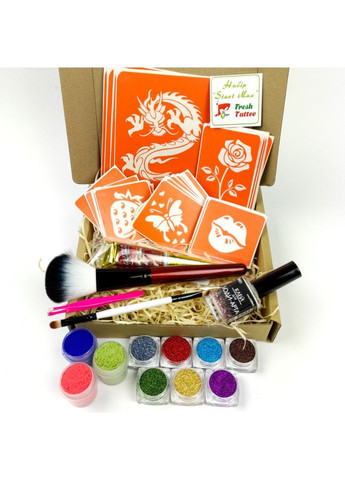 Набір для біо-тату; Старт - макс 2.0; містить: 1 клей для біотату прозорий; 7 гліттерів (коричневий, лимонне золото, темне срібло, бірюзово-зелений, морська хвиля, фіолетовий, різдвяний червоний); 3 оксамиту (синій, темно-салатовий, кораловий); 1 хна в конусі (коричнева); 1 пінцет; 1 кисть для скидання велика; 1 пензля для гліттера двостороння; 1 кисть для клею; 32 трафарети 6*6 см; 8 трафаретів 6*10см; 5 трафаретів 10*15см. Як зробити біо-тату: виберіть рівномірну ділянку шкіри; добре знежирте його; зніміть із трафарету білу підкладку (паперова основа трафарету); приклейте трафарет на суху та знежирену шкіру; обережно зніміть прозору плівку і переконайтеся, що трафарет (помаранчева частина) щільно приклеєний до шкіри; нанесіть рівномірний шар клею для боді-дизайну та дайте йому просохнути (від 30 секунд до 2 хвилин залежно від шару клею); нанесіть глітер (блискітки) на клей і щільно вбийте його пензлем для глітера; змахніть надлишки гліттера пензлем-кошторисом і зніміть трафарет. Для чого потрібний трафарет: якщо не вмієте малювати від руки; якщо потрібно багато та швидко малювати; потрібно створювати однакові і за розміром, і на вигляд малюнки - скористайтеся трафаретами Fresh Tattoo; трафарети Fresh Tattoo безпечні для шкіри і підходять для нанесення тимчасових тату всіх типів: гліттер-тату, хною, оксамитом, пігментом, джагуа-гелем і так далі; підходять для хімічного або піскоструминного матування виробів зі скла (чашки, келихи, дзеркала);
