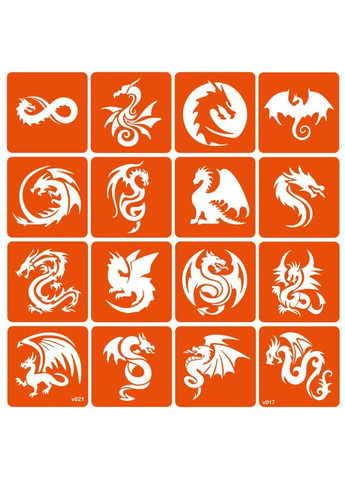 Колекція простих трафаретів драконів, 16 штук у розмірі 6 на 6 см. Як зробити біо-тату: виберіть рівномірну ділянку шкіри; добре знежирте його; зніміть із трафарету білу підкладку (паперова основа трафарету); приклейте трафарет на суху та знежирену шкіру; обережно зніміть прозору плівку і переконайтеся, що трафарет (помаранчева частина) щільно приклеєний до шкіри; нанесіть рівномірний шар клею для боді-дизайну та дайте йому просохнути (від 30 секунд до 2 хвилин залежно від шару клею); нанесіть глітер (блискітки) на клей і щільно вбийте його пензлем для глітера; змахніть надлишки гліттера пензлем-кошторисом і зніміть трафарет. Для чого потрібний трафарет: якщо не вмієте малювати від руки; якщо потрібно багато та швидко малювати; потрібно створювати однакові і за розміром, і на вигляд малюнки - скористайтеся трафаретами Fresh Tattoo; трафарети Fresh Tattoo безпечні для шкіри і підходять для нанесення тимчасових тату всіх типів: гліттер-тату, хною, оксамитом, пігментом, джагуа-гелем і так далі; підходять для хімічного або піскоструминного матування виробів зі скла (чашки, келихи, дзеркала);