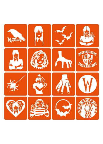 Колекція трафаретів Венсдей Адамс, 16 штук у розмірі 6 на 6 см. Як зробити біо-тату: виберіть рівномірну ділянку шкіри; добре знежирте його; зніміть із трафарету білу підкладку (паперова основа трафарету); приклейте трафарет на суху та знежирену шкіру; обережно зніміть прозору плівку і переконайтеся, що трафарет (помаранчева частина) щільно приклеєний до шкіри; нанесіть рівномірний шар клею для боді-дизайну та дайте йому просохнути (від 30 секунд до 2 хвилин залежно від шару клею); нанесіть глітер (блискітки) на клей і щільно вбийте його пензлем для глітера; змахніть надлишки гліттера пензлем-кошторисом і зніміть трафарет. Для чого потрібний трафарет: якщо не вмієте малювати від руки; якщо потрібно багато та швидко малювати; потрібно створювати однакові і за розміром, і на вигляд малюнки - скористайтеся трафаретами Fresh Tattoo; трафарети Fresh Tattoo безпечні для шкіри і підходять для нанесення тимчасових тату всіх типів: гліттер-тату, хною, оксамитом, пігментом, джагуа-гелем і так далі; підходять для хімічного або піскоструминного матування виробів зі скла (чашки, келихи, дзеркала);