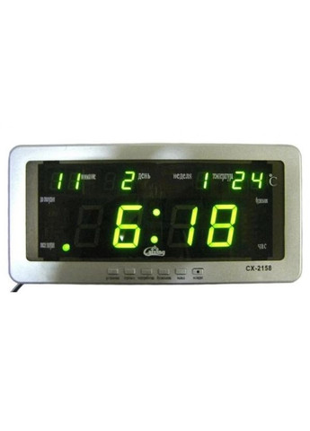 Годинник CX-2158 – невеликий будильник, виконаний у класичному дизайні, має прямокутну форму зі злегка закругленими кутами. Такий кімнатний годинник добре виглядатиме як у спальні, так і у вітальні або на кухні, а також у діловій обстановці. ; Відмінна видимість цифр, російський дисплей, встановлення різного часу будильників, є щогодинний будильник, підсвічування можна зменшувати додавати (за бажанням, підсвічування зеленого кольору), налаштування легко встановити (зручне та зрозуміле розташування кнопок для налаштувань під екраном ). Час виставити можна в режимі 12 годин, так і 24. Такий годинник можна поставити в будь-якому автомобільному транспорті, т.к є в них «прикурювач ». Корпус чорний, підсвічування електронного циферблату. Характеристики: LED дисплей Працюють від 220 В Працюють від 12В прикурювача автомобіля (перехідник у комплекті) Вішаються на стіну або ставляться Будильник Календар Термометр Розмір рамки 22х10,5см Відмінний годинник для маршруток і автобусів