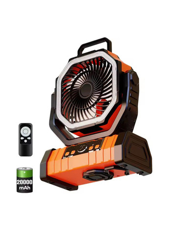 Настільний вентилятор з акумулятором на 20000 mAh, підсвіткою, павербанком, регулюванням кута нахилу та 4 швидкісними режимамиНадзвичайно потужний вентилятор, який стане в нагоді як в домашніх умовах, так і в походах, для кемпінгу чи в польових умовах. Пристрій є багатофункційним, витривалим. За допомогою висувного гачка вентилятор можна не лише ставити на поверхні, а й підвішувати на будь-якій зручній висоті.Особливості:Регулювання кута нахилу по вертикалі та горизонталі. Ви зможете задати вентилятору будь-яке потрібне вам положення. Також модель оснащена функцією автоматичного обертання.Підсвічування. Рухома частина вентилятора має функцію підсвічування – світлодіоди розташовані по всьому периметру, що створює потужний потік світла. Можна налаштувати три режими яскравості.Вмонтована батарея потужністю 20 000 mAh. Такого обсягу акумулятора вистачає для тривалої портативної роботи вентилятора – на першому режимі пристрій працюватиме до 6 діб, якщо не вмикати інші функції (на другому режимі заявлений час роботи – 3 доби, на третьому – 36 годин та на четвертому – 24 години).Чотири режими швидкості. Ви самостійно обираєте, яка швидкість для вас найбільш комфортна.Працює як павербанк. До пристрою можна під’єднати ваш телефон чи ноутбук через Type-C з’єднання і ваші девайси будуть заряджатись. Не потрібно брати з собою павербанк окремо, пристрій поєднує у собі функцію павербанка з вентилятором.Таймер. Користувач має змогу задати час до автоматичного відключення вентилятора, що зручно при користуванні пристроєм увечері.Декілька позицій кріплення. Стандартна позиція – встановлення вентилятора на будь-якій поверхні, проте модель оснащено гачком – ви можете легко підвісити її на будь-якій потрібній висоті. Пульт дистанційного керування. Аби не бігати до вентилятора та натискати кнопки кожного разу, як вам щось потрібно, ви можете перемикати всі функції за допомогою пульта дистанційного керування. Характеристики:Виробник: Blue Oxinuo; Модель: F6 Camping Fan;Розміри: 28,5 х 22 х 11,5 см;Вага: 1,32 кг;Кількість лопатей: 3; Кількість швидкісних режимів: 4; Ємність акумулятора: 20 000 mAh Дистанційне керування: Так (пульт).
