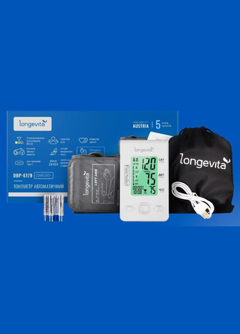 Опис Longevita DBP-6175 Comfort+: Автоматичний тонометр Longevita DBP-6175 Comfort+ поєднанує всі найсучасніші технологій в області медичної техніки та втілює їх в прості та надійні у використанні товари, що відповідають інтересам наших вимогливих клієнтів. Тонометри Longevita серії Comfort+ - прилади австрійської якості та функціональності, з особливою увагою до деталей та потреб людей різних вікових груп та використовують сучасні технології - вимірювання тиску відбувається на етапі нагнітання повітря в манжету, що робить процес виміру більш легким та комфортним для користувача. Такий спосіб вимірювання дозволяє значно скоротити час вимірювання (всього близько 30 сек) та запобігає надмірному нагнітанню повітря в манжету та неприємного здавлювання руки. Сучасний дизайн, чіткий, великий рідкокристалічний дисплей чорного кольору з білою підсвіткою, великі цифри, гарні кути огляду, голосовий супровід, індикатор правильного накладання манжети та індикатор руху, порт живлення TYPE-C – все це робить його зручним та комфортним у повсякденному користуванні. Longevita піклується про своїх клієнтів, тому комплектує свої тонометри якісними та зручними манжетами. В комплект до тонометру, Модель DBP-6175, входить збільшена манжета (22-42 см) - універсальна. Завдяки широкому розміру липучки, манжета легко фіксується на руку. Для виготовлення манжети використовуються гіпоалергенні синтетичні матеріали. Її край має м'яке окантування для зняття тиску на руку. Для зняття точних показників артеріального тиску людині досить правильно зафіксувати манжету на плечі та натиснути одну кнопку. Далі голосовий помічник допоможе при вимірюванні. Через кілька секунд на дисплеї висвічуються дані, а голосовий помічник їх вам повідомить та потім порівняє з класифікатором тиску за нормами ВООЗ. Висока точність вимірювання дає можливість використовувати пристрій не тільки для домашнього використання, але й у різноманітних медичних установах. Особливості автоматичного тонометра на плече Longevita DBP-6175 Comfort+: ¤ Конусоподібна манжета c універсальним розміром 22-42 см ¤ Індикатор аритмії ¤ Збільшений екран з підсвічуванням ¤ Голосовий помічник. Має повний голосовий супровід процесу вимірювання українською мовою. Супроводжує протягом вимірювання, попереджає про початок вимірювання, повідомляє результати виміру (САТ, ДАТ, ЧСС), а потім порівняє з класифікатором тиску за нормами ВООЗ. Також функція голосового помічника допоможе при перегляді вимірювань з пам'яті приладу. Для зручності гучність голосового помічника можна регулювати в налаштуваннях або зовсім його відключити. ¤ Індикатор руху. Якщо під час вимірювання відбувається рух руки, то індикатор повідомляє про це. Це вказує на те, що результати вимірювань можуть бути неточними. ¤ Індикатор правильного розташування манжети. Якщо манжета розташована неправильно або надто вільно зафіксована на плечі, то індикатор про це повідомить. ¤ Середнє значення 3-х останніх вимірювань, що дозволяє чіткіше визначати рівень тиску ¤ Автоматичне відключення після виміру ¤ Пам’ять по 150 значень для кожного з двох користувачів, ¤ Індикатор елементів живлення, дата та час Технічні характеристики тонометра автоматичного на плече Longevita DBP-6175 Comfort+: • Метод вимірювання: осцилометричний • Алгоритм вимірювання: Inflation Measuring System (вимірювання під час нагнітання пові