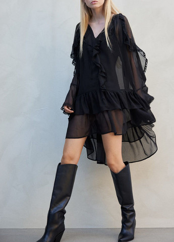 Сукня вільного крою довжиною до коліна з ніжного, гофрованого шифону. Сукня має круглий виріз горловини з воланом та вузькими зав'язками. Довгий рукав з мереживними воланами на плечах і кінцях рукавів, оздобленими мереживом. Вигнутий розділовий шов і два зібраних яруси спідниці. Без підкладки.