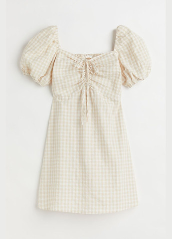 Коротка сукня із тканого матеріалу. Вирізання серцем для зав'язування шнурка спереду. Короткі рукави-ліхтарики з тонкою гумкою на внутрішній стороні плечей та манжетах. Частина спини гофрована. Нерівний крій на талії. Спіднична частина має трохи розкльошений силует. Без підкладки. Виміри на розмір XS: ПОТ-32 см. ПОБ-48 см. Довжина виробу по спинці-72 см. У виробі можливе пошкодження бирки.